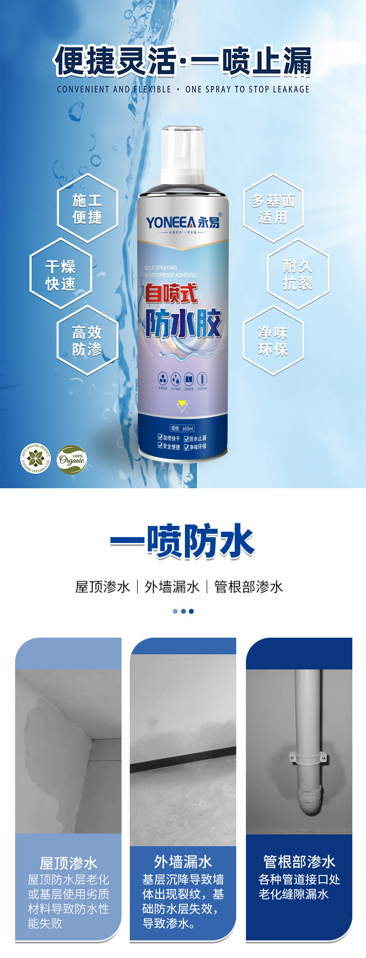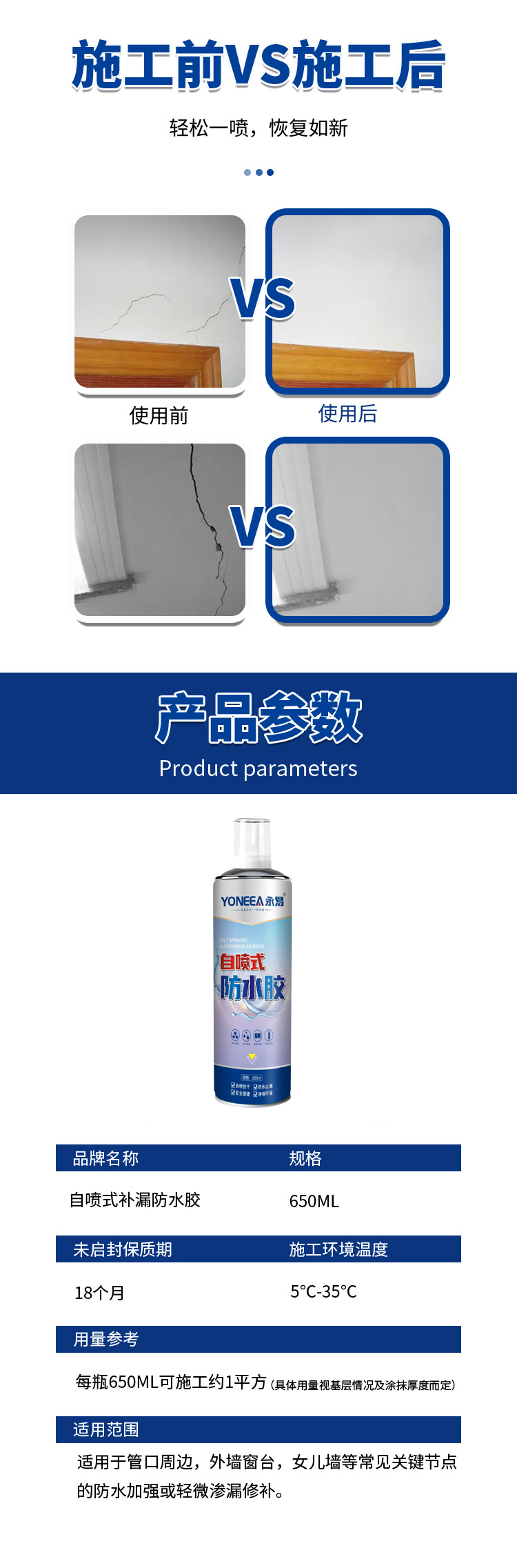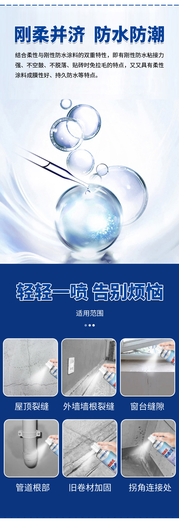 适用于管口周边、外墙窗台、女儿墙等常见关键节点的防水加强或轻微渗漏修补。